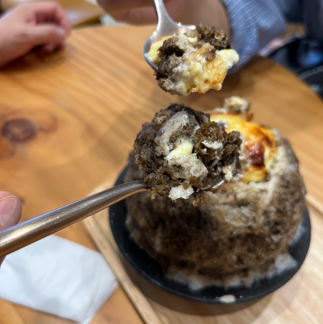 너무 달지 않아서 완전 취향저격이었던 호지차크림브륄레 빙수. 😊 찍지 못했지만 안 쪽에는 떡같은 것도 들어있고 젤리같은 것도 들어있어요. 다양한 식감도 즐길 수 있고 다른 곳에서 쉽게 즐길 수 없는 디저트라 융캉제 근처 빙수, 디저트 카페 찾으시면 JINGIMOO 추천드립니다.