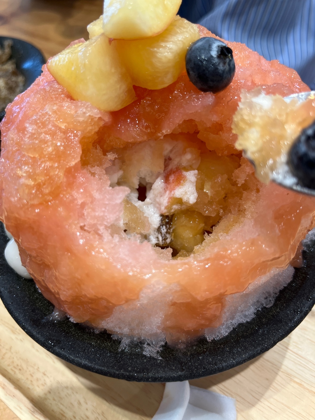 빙수 안쪽에도 이렇게 복숭아조림 과육들이 있습니다. 젤리같은 것도 있고요. 마찬가지로 복숭아, 젤리, 떡, 빙수 식감이 잘 어울렸어요. 복숭아 향도 많이 느낄 수 있는 빙수였습니다.
