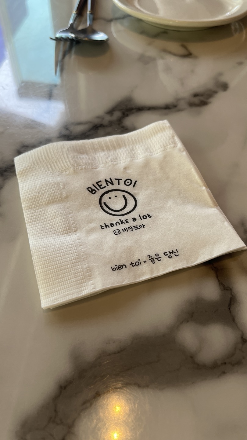 귀여운 티슈. 비앙또아는 좋은 당신이라는 의미라네요. 발리에 다녀온 친구와 만난 터라 입욕제와 다크초콜렛도 선물로 받고 ㅎㅎ 즐겁게 브런치 즐기며 수다삼매경. 노키즈존이 아니라서 아이들 데리고 온 테이블이 많았어요. 내부 자리에는 유모차 반입이 안되는 것 같으니 확인해보고 방문하시면 좋을 듯 합니다.