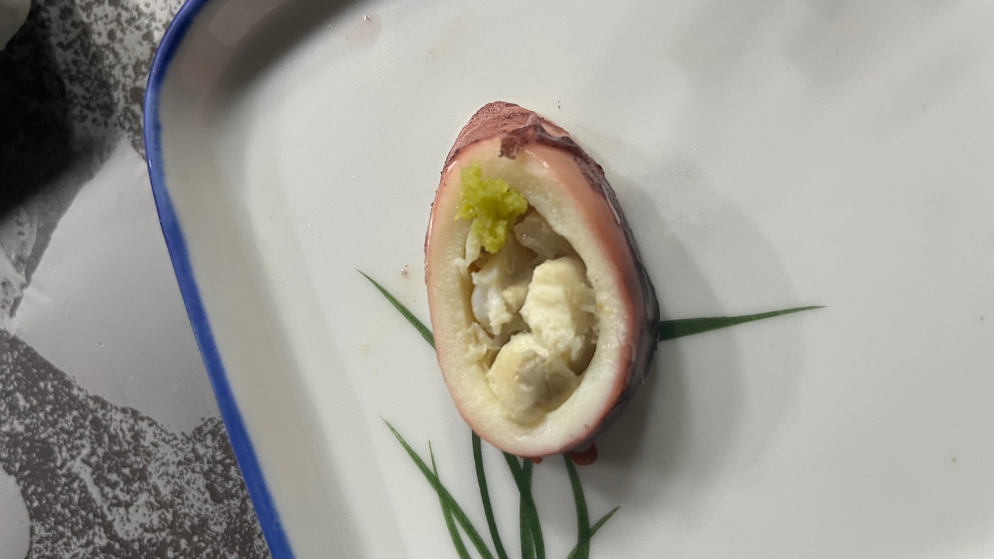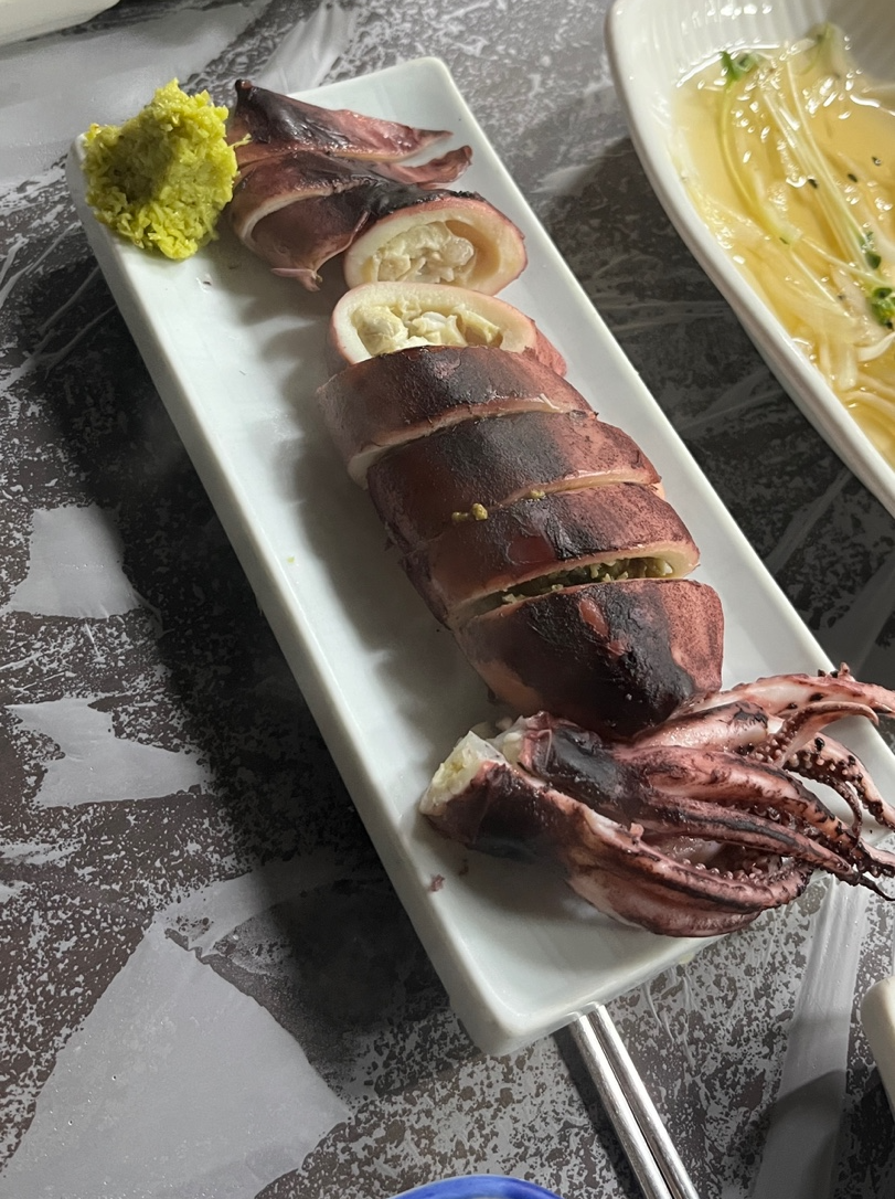 다음으로 나온 통오징어..찜이라고 해야할까요. 안에는 오징어 내장이랑 여러가지가 들어있는 것 같은데 솔직히 잘 모르겠다는 😂 근데 맛있습니다. 요즘 오징어값도 엄청 올라서 회 먹을려고 해도 한 접시에 3만원씩 하던데 아주 통통하고 실하고 맛있었어요. 소주 맛이 절로 생각나는 메뉴들~