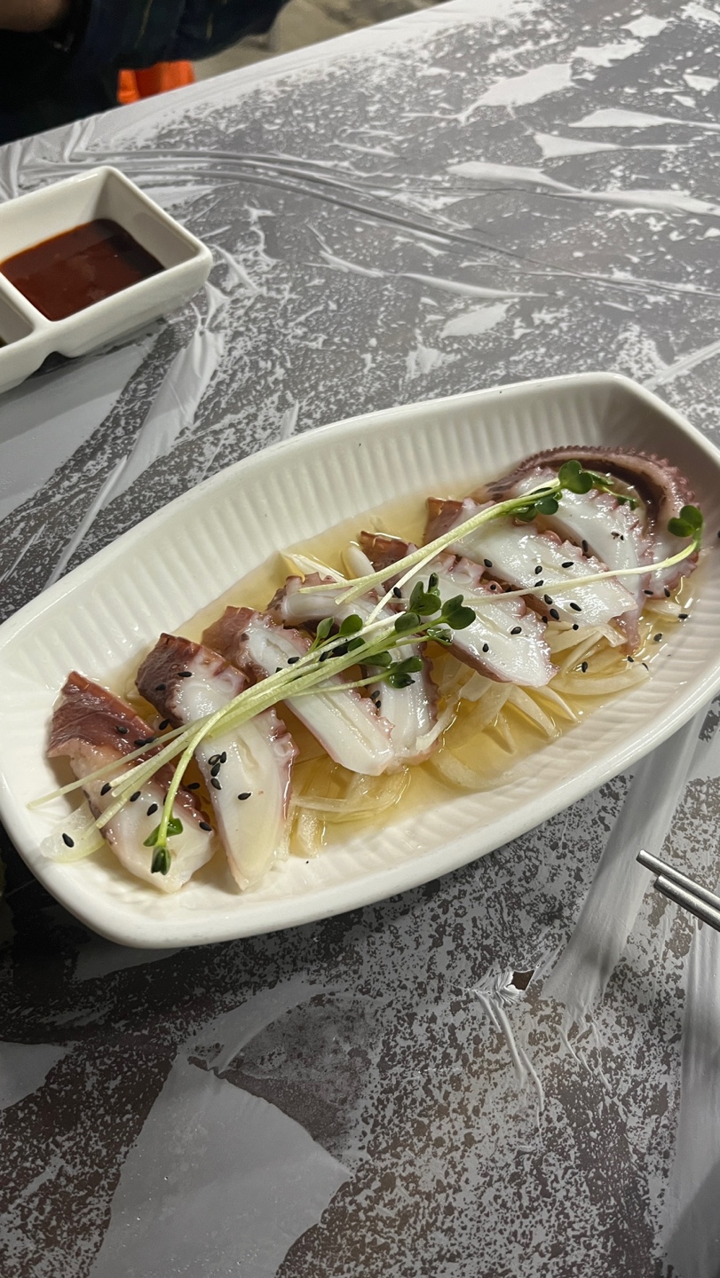 일단 문어가 먼저 나오는데요. 아래에 양파초절임?이 아주 상큼하고 맛있어요. 시큼한 것이 아니라 달짝지근하면서 상큼해서 입맛을 돋구는데 제격이었습니다. 가진항은 자연회 전문점이라 사장님들이 시장에서 그날그날 재료를 떼어오시고 직접 손질해서 내어주신다고 알고있어요.