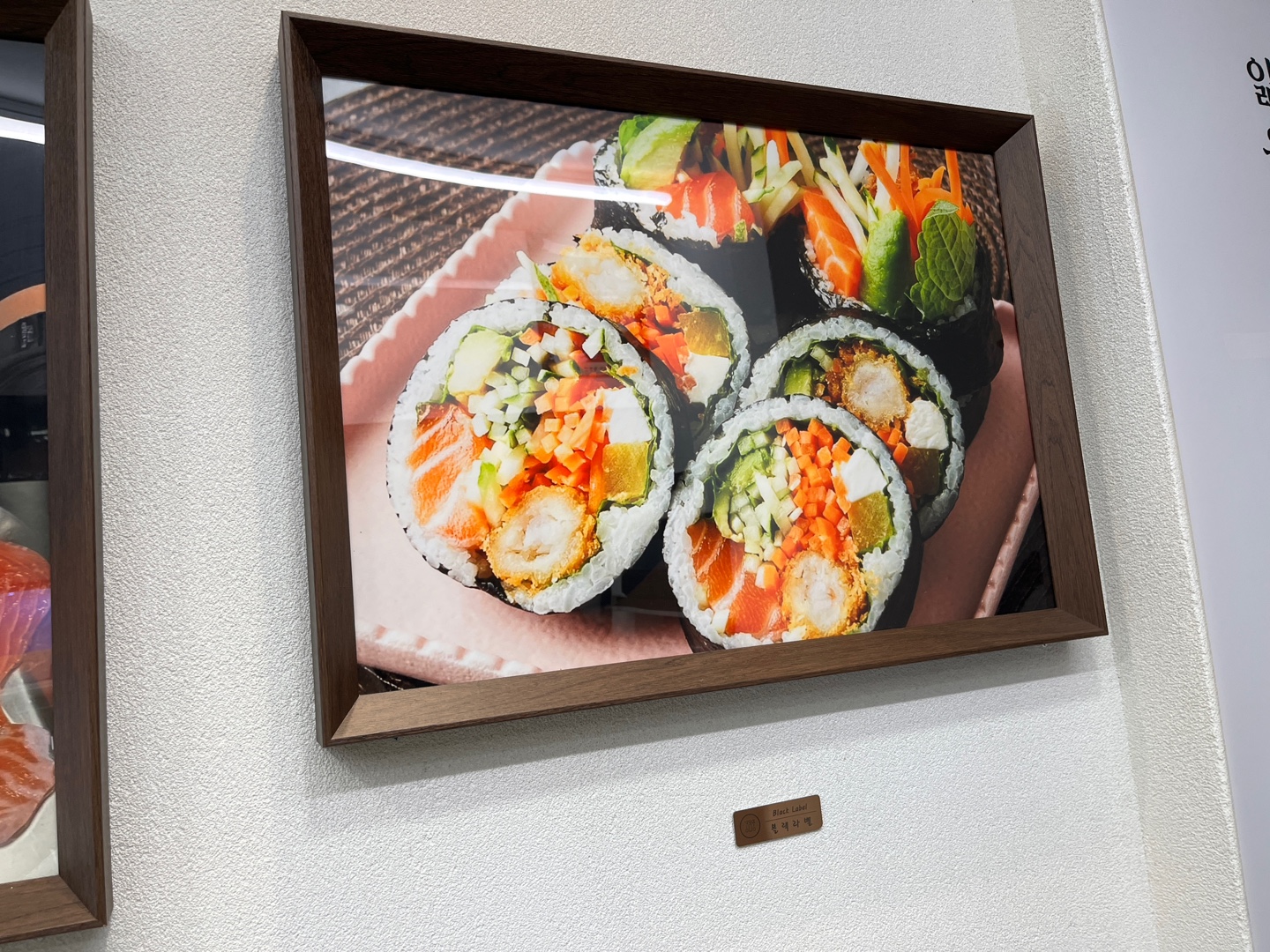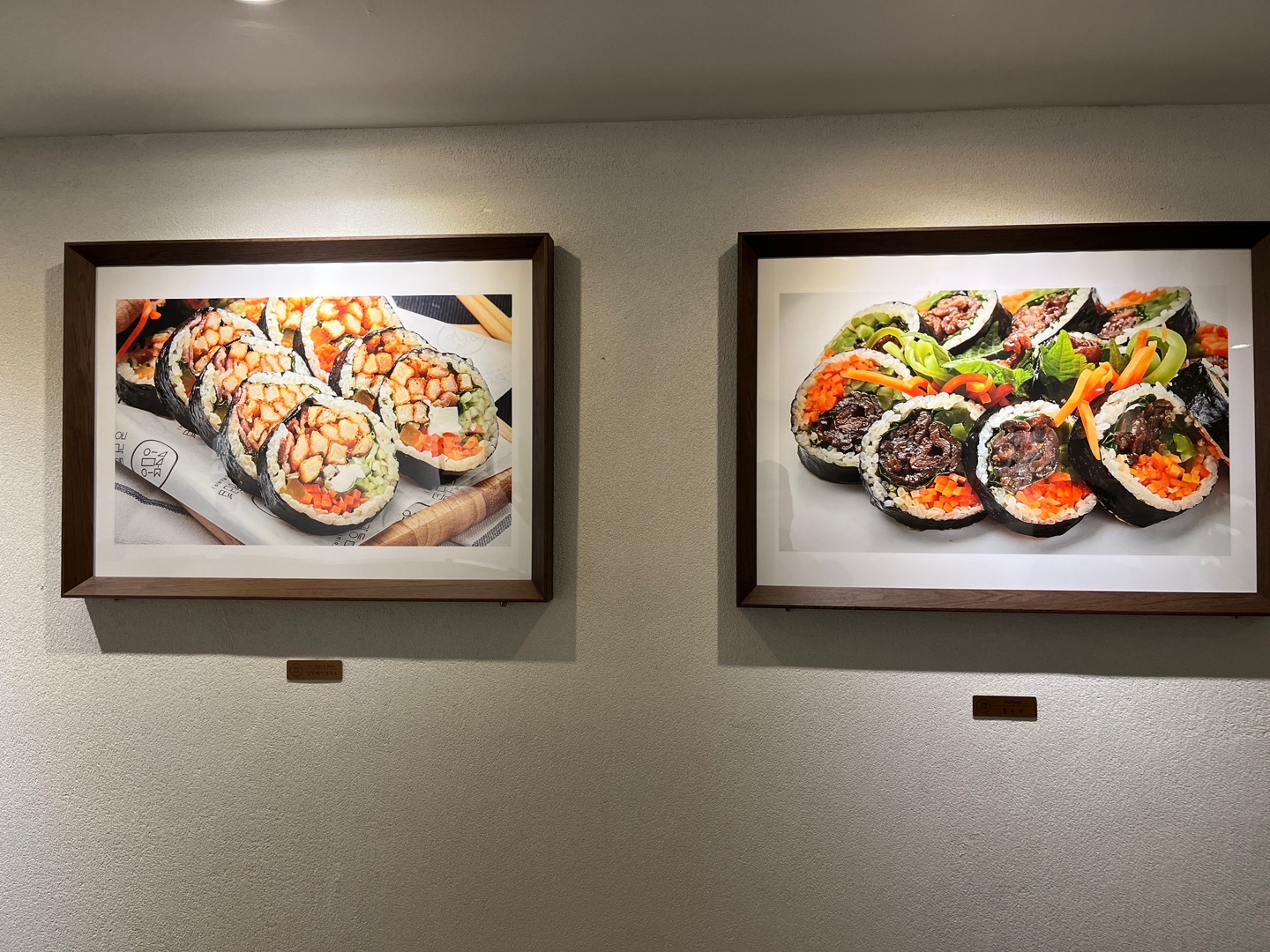 벽에 걸려있는 김밥 사진들보면 식욕이 뿜뿜.. 판매 중인 메뉴들이어서 그런지 이렇게 직관적으로 보여서 좋더라구요. 이 그림들을 보고 김밥 한줄 더 추가로 주문할까? 고민했답니다. 사실 요즘 집에서도 김밥 말아먹는 데에 빠져있어서 맛있는 김밥 먹으면 포만감도 좋고 기분도 좋고..