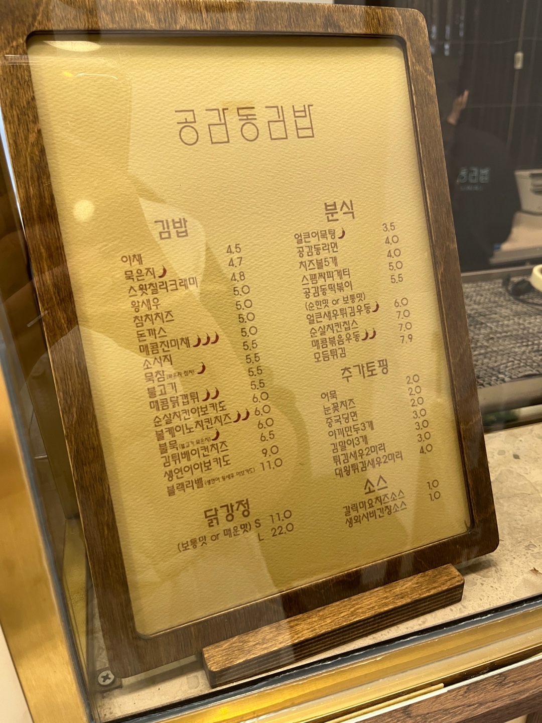 규모가 크진 않습니다. 1층에서는 취식이 안되고 대기할 수 있는 긴 의자만 있어요. 2층에 올라가서 자리를 잡아야 합니다. 자리가 넓거나 여유롭진 않아서 단체 방문보다는 2~4인 정도가 적당해보여요. 공감동김밥에서는 닭강정도 판매하고 있습니다. 김밥 종류도 꽤나 다양해서 기호에 따라 주문할 수 있습니다.
