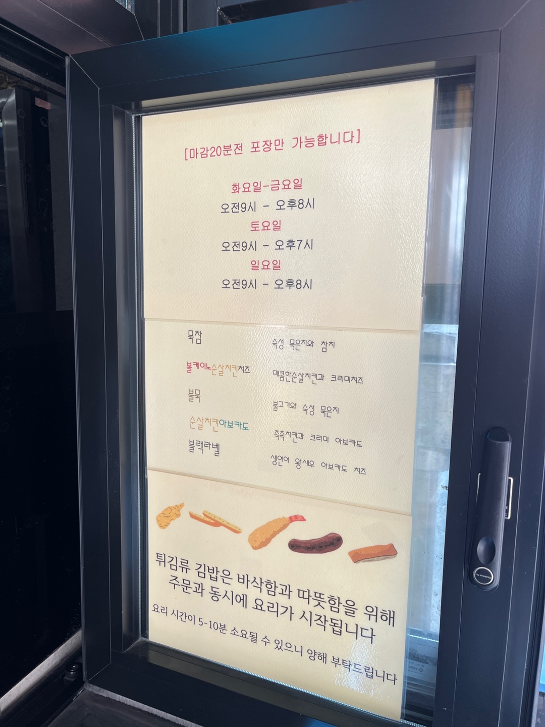 위에 적혀있는 공감동김밥 브레이크타임도 꼭 숙지해주시고요. 마감 20분 전 포장만 가능하다 합니다. 특히 튀김류가 들어간 김밥은 바삭함, 따뜻함을 위해 주문과 동시에 요리가 시작되어 5~10분 가량 소요될 수 있다고 하니 참고하세요.