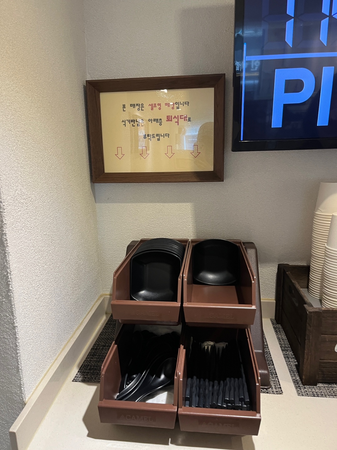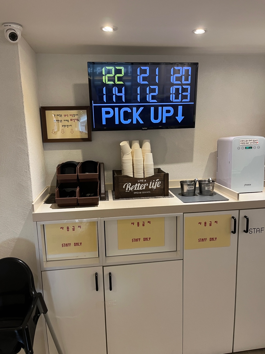 주문하고 2층에서 기다리면 (취식하는 경우) 번호가 전광판에 뜨는데요. 확인하고 픽업하러 내려가면 됩니다. 물, 숟가락, 젓가락, 단무지, 김치 등은 모두 셀프로 이용할 수 있어요. 깔끔하게 유지되고 있어서 좋았습니다. 다만 음식을 가지고 올라올 때 아무래도 계단을 이용해야 하는데 폭이 좁아서 조금 불안하더라구요.