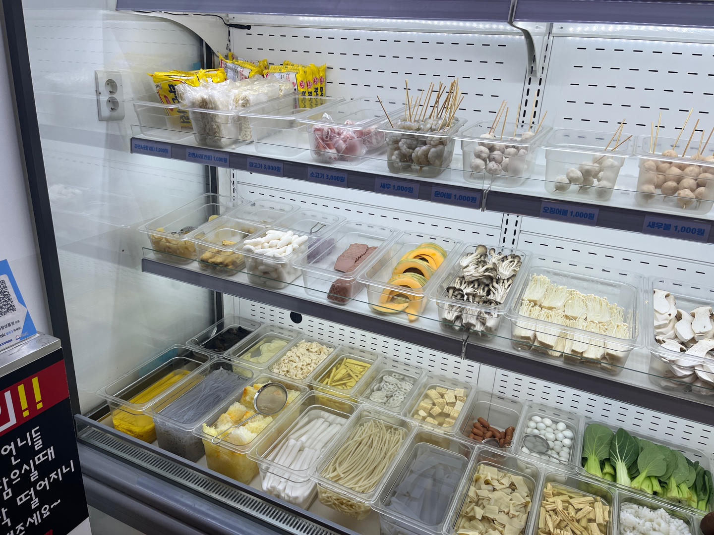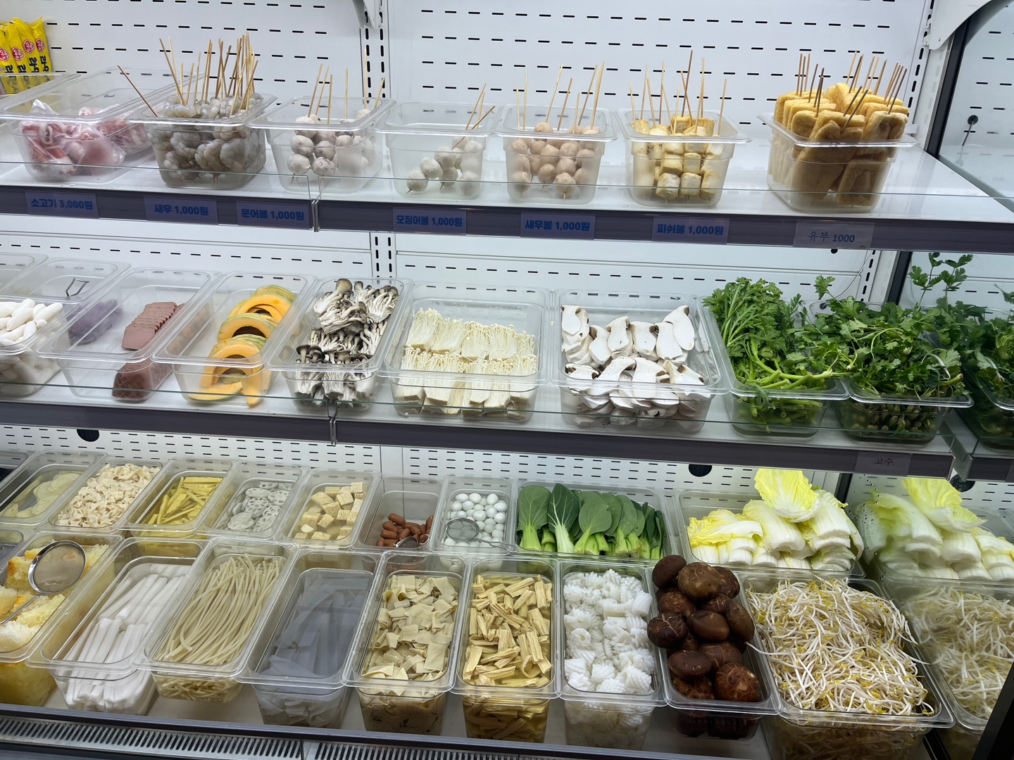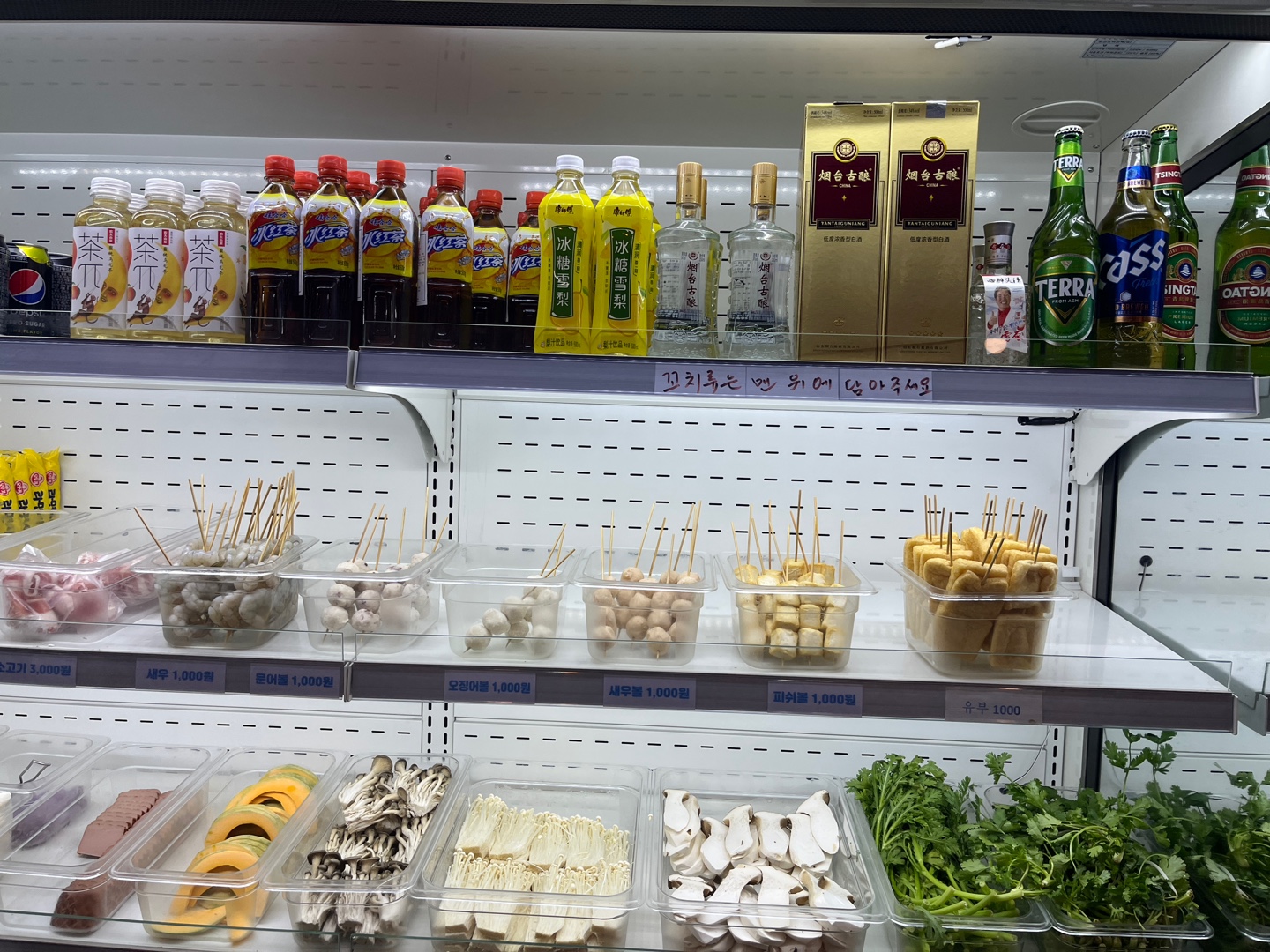 다양한 재료들이 냉장보관되고 있는데요. 정갈하고 깨끗하게 관리되고 있어요. 카운터 바로 앞이라 부족해지면 채워주시고 있을 건 다 있답니다. 버섯류, 야채, 꼬치, 고기, 햄, 떡, 각종 면 등등.. 정말 기호에 맞게 넣어 먹을 수 있다는 것이 마라탕과 마라샹궈의 장점인 것 같아요.