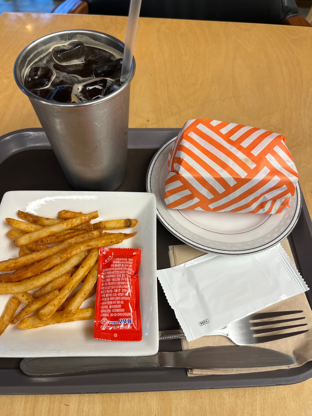 우선, 꼭 패스트푸드점 같이 나와서 놀랐어요. 감자튀김의 존재를 모르고 있었는데 받아서 처음엔 당황스러웠는데 또.. 좋더라구요. 😂 음료는 콜라같아보이지만 아이스 아메리카노입니다. 커피가 아주 맛있어요. (개인적으로 진하고 다크한 커피를 좋아합니다.)