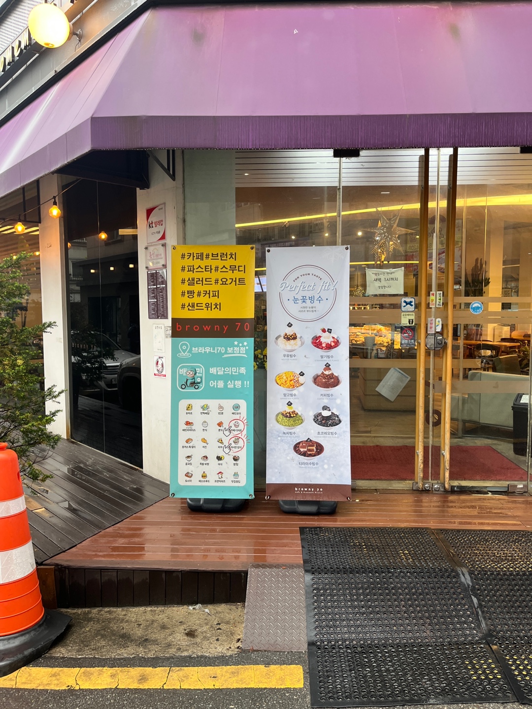 한두달에 한번 오는 보정동인데 늘 비슷한 분위기. 그래서 더 좋기도 하구요! 특히 브라우니70은 이 자리에 오랫동안 있는 것 같아요. 빙수, 브런치, 다양한 빵과 커피, 음료들을 판매하고 있습니다. 이른 시간임에도 불구하고꽤 많은 분들이 커피와 빵 드시고 계셨어요.