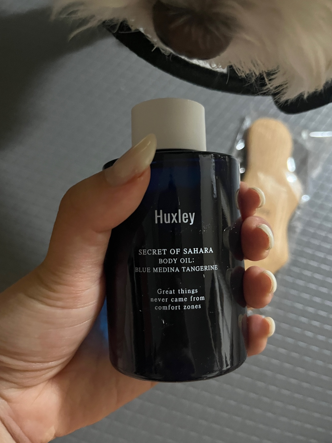 헉슬리 바디오일은 샤워한 후에 물기가 약간 남아있는 상태에서 바른 후에 괄사 이용해 마사지 해주시는 것을 권장하고 있는데요. 저는 샤워후 선풍기로 머리를 말리면서 바디크림 바르고 그 위에 바디오일 도포한 후에 마사지를 진행하고 있어요. 그럼 정말 보습이 쫀쫀하답니다.