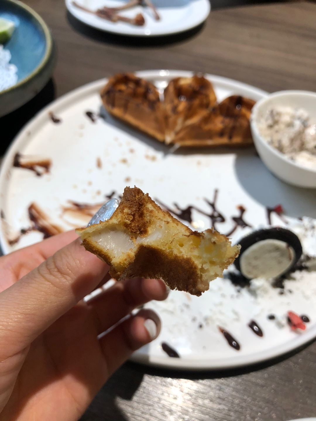 그리고 무엇보다 모찌와플이 너무나 제 스타일인거에요. 안에 반죽이 쫀득해서 식감도 좋고 중독성있어서 자꾸 들어가더라구요? 한국에서는 못 보았던 모찌와플인데 😂 집에도 와플기를 구비해놓을 정도로 와플을 사랑하는 1인이라 모찌와플 어떻게 만드는건지 배워가고 싶을 정도였답니다. 반죽에 모찌를 넣으면 되는걸까요?