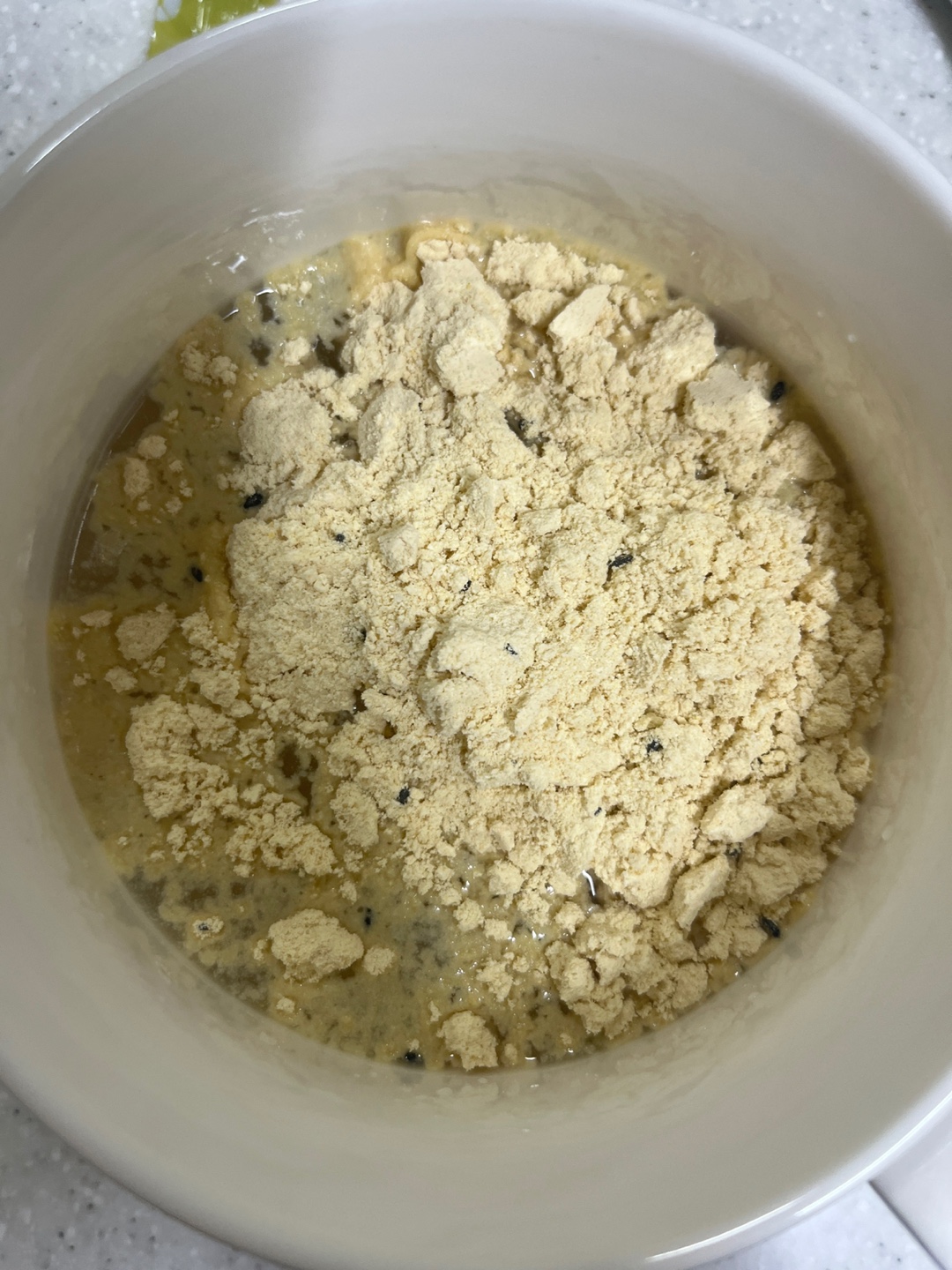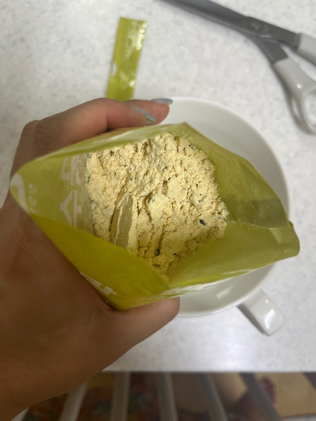 풀어주면 대략 이런 모습을 보입니다. 일단 고소한 냄새가 많이 나지는 않았고, 분말을 물에 풀어주는 과정이 조금 귀찮기는 했답니다. 😂 생각보다 빨리 자연스럽게 풀어지진 않아서 숟가락으로 뭉친 가루들 눌러주는 과정들이 필요했어요. 그리고 콩국물만 한입 떠 먹어봤는데 음.. 생각보다는 실망스러웠습니다.