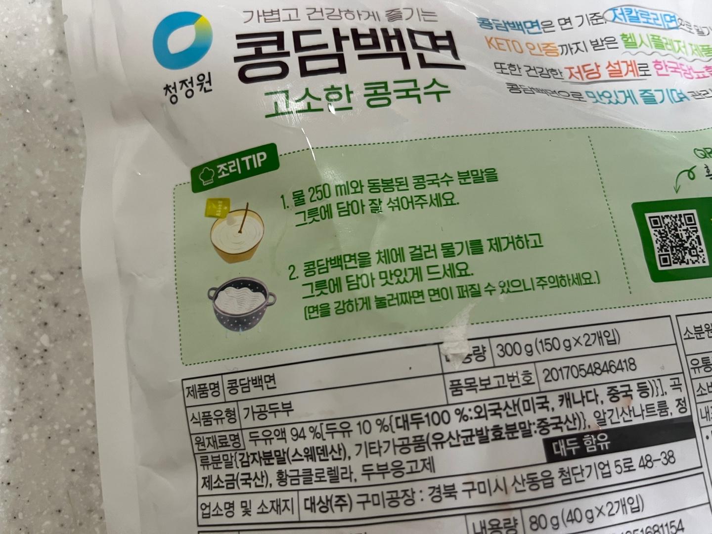 keto인증도 받았다고 적혀있네요. 칼로리도 콩담백면 자체는 30kcal밖에 되지 않습니다. 콩국수 분말이 170kcal더라구요. 그래서 1인분 200kcal입니다. 콩담백면만 따로 판매해도 좋을 것 같단 생각이 들었어요. 비빔국수나 다양한 용도로 활용이 가능할 것 같아서요.