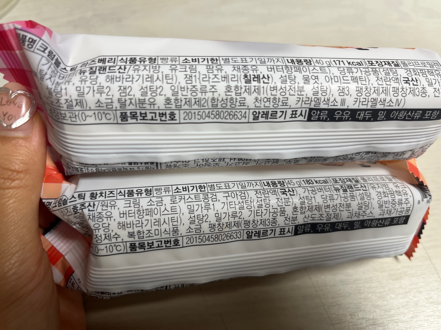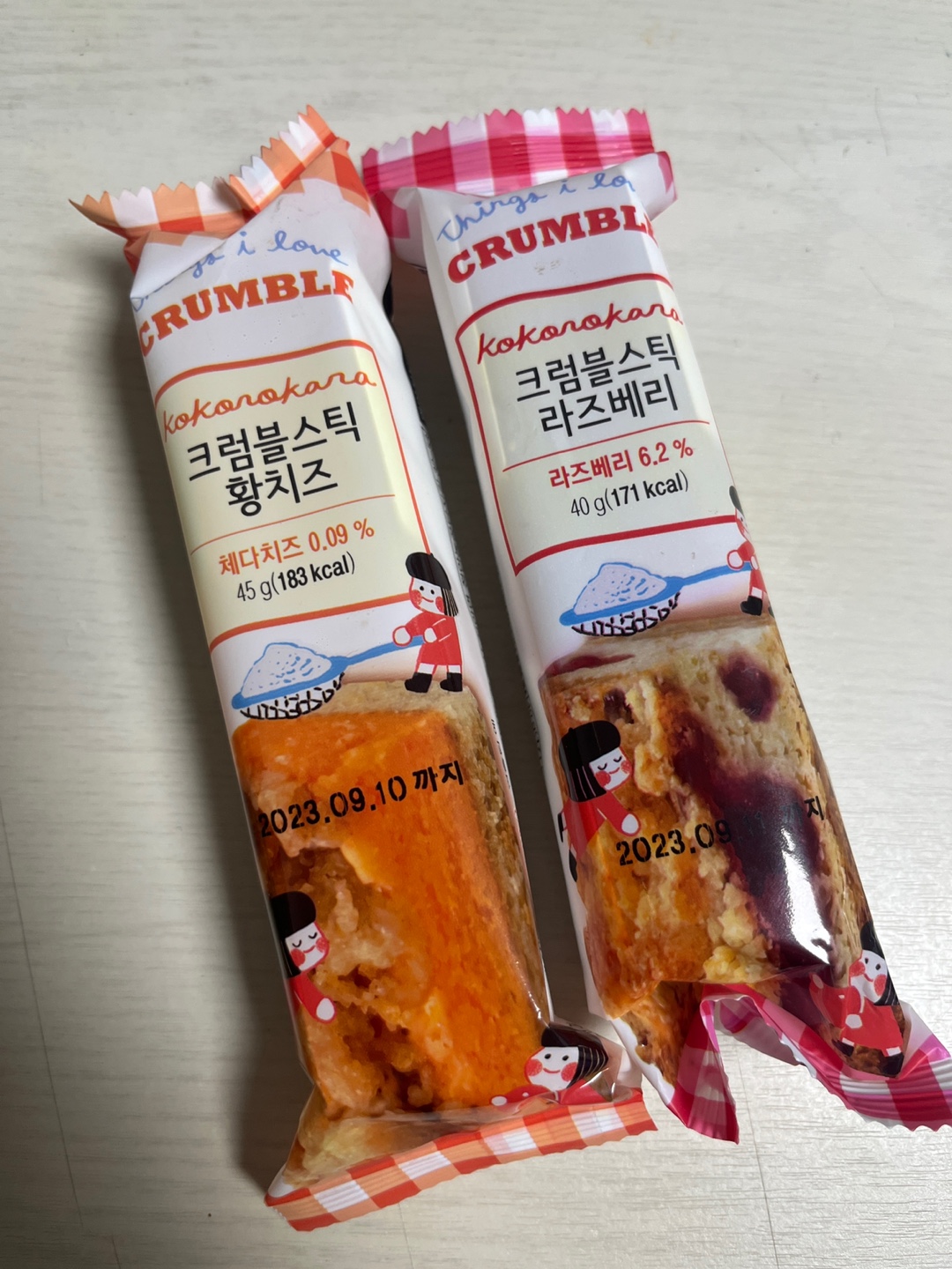 크럼블스틱 황치즈는 45g, 라즈베리는 40g으로 중량에 차이가 있습니다. 칼로리도 황치즈가 조금 더 높아요. 참고하시기 바랍니다. 한 손에 쏙 들어오는 아담한 크기로 커피와 즐기기 안성맞춤인 디저트입니다.