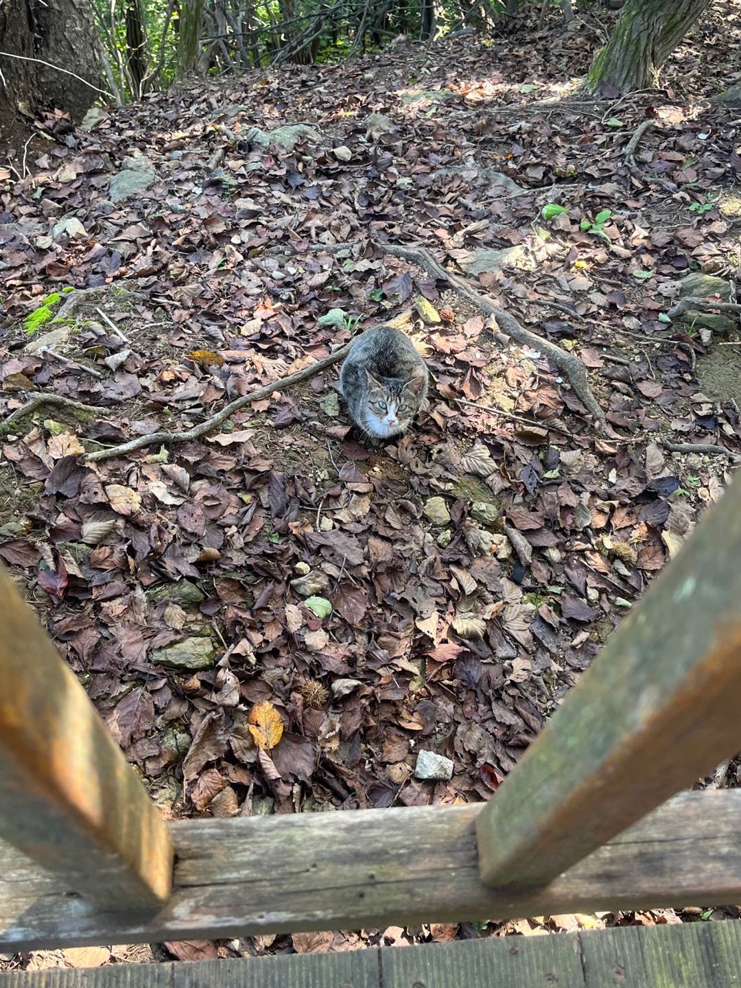 광교산 등산코스에서 만난 고양이. 물그릇, 밥그릇 들이 있는 걸 보면 주기적으로 챙겨주시는 분들이 있는 모양이에요.