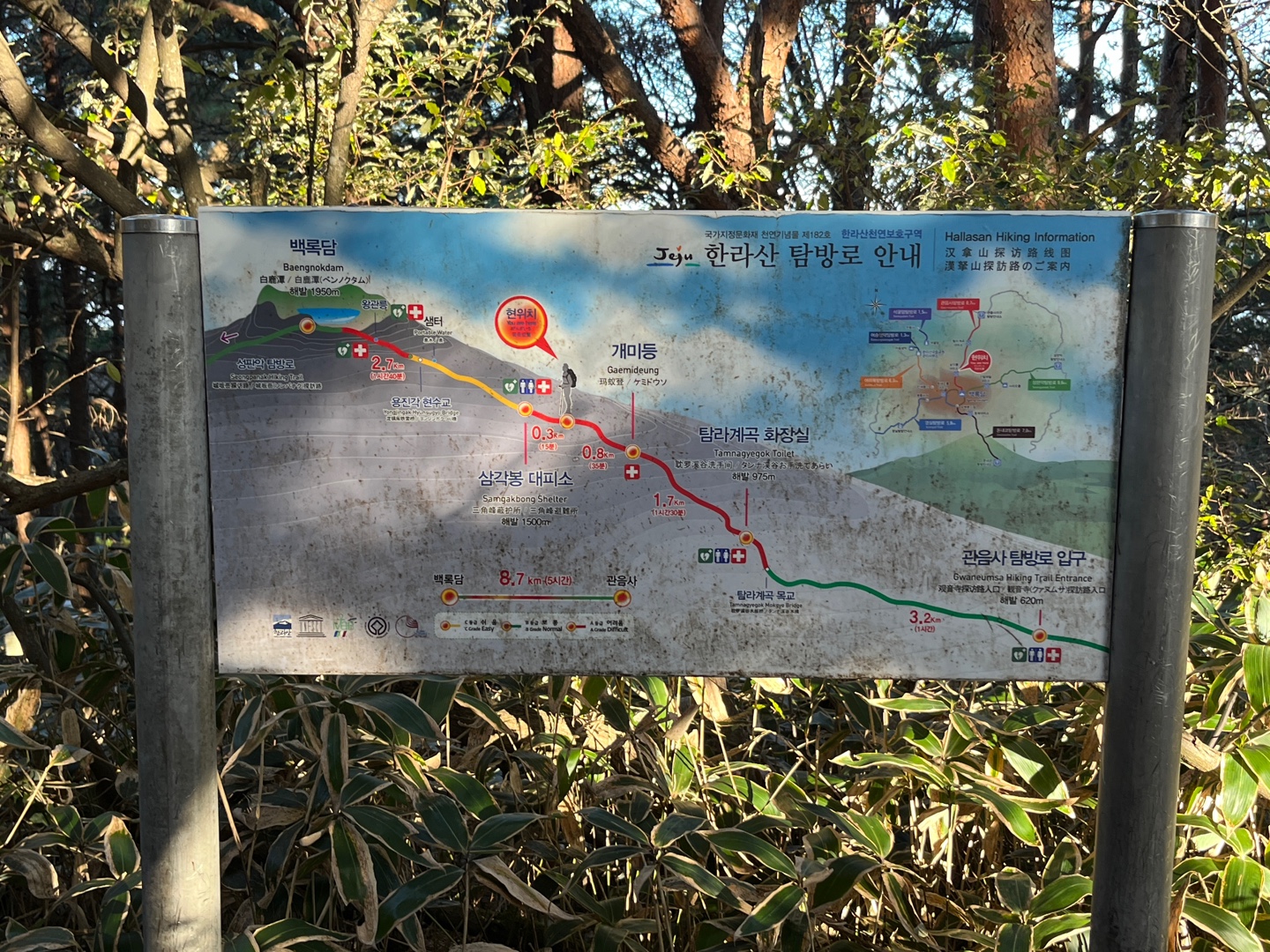 관음사는 비교적 가파르나 풍경이 더 예쁘다는 후기가 많았습니다. 조금 더 힘들지만 시간은 짧다라는 평. 그리하여 올라갈 때 후다닥 가보자 하는 마음에 등산길을 관음사 코스로 정하였습니다.