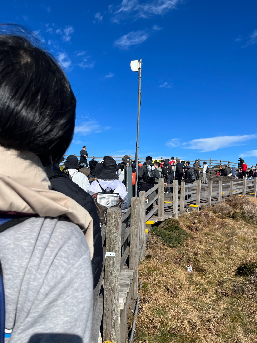 사진 촬영하고, 김밥도 챙겨먹고 주전부리 먹고 물도 먹고 성판악으로 하산합니다. 저 길게 늘어진 줄이 모두 정상석 촬영을 위한 대기줄입니다. 어마어마하죠- 그러니 가급적! 빠르게 오르셔서 후다닥 촬영하시고 식사하시고 내려가시는 것을 추천드립니다. 시간이 너무 아깝잖아요~