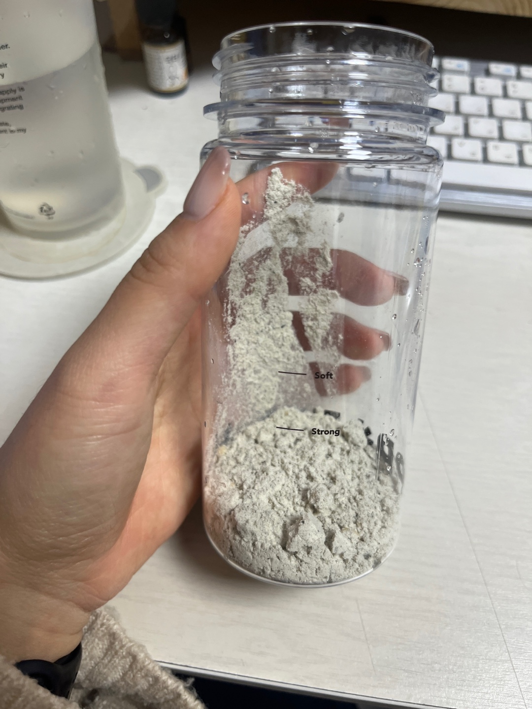 야무지게 두 스쿱 떠서 바틀에 넣어줍니다. Strong, Soft 선이 표시되어 있는데요. 액체를 어디까지 넣느냐에 따라 조금 더 진하게 먹을 수도 있고 연하게 묽게 타 줄 수도 있습니다. 저는 보통 저 중간 정도로 타주는 것 같아요.