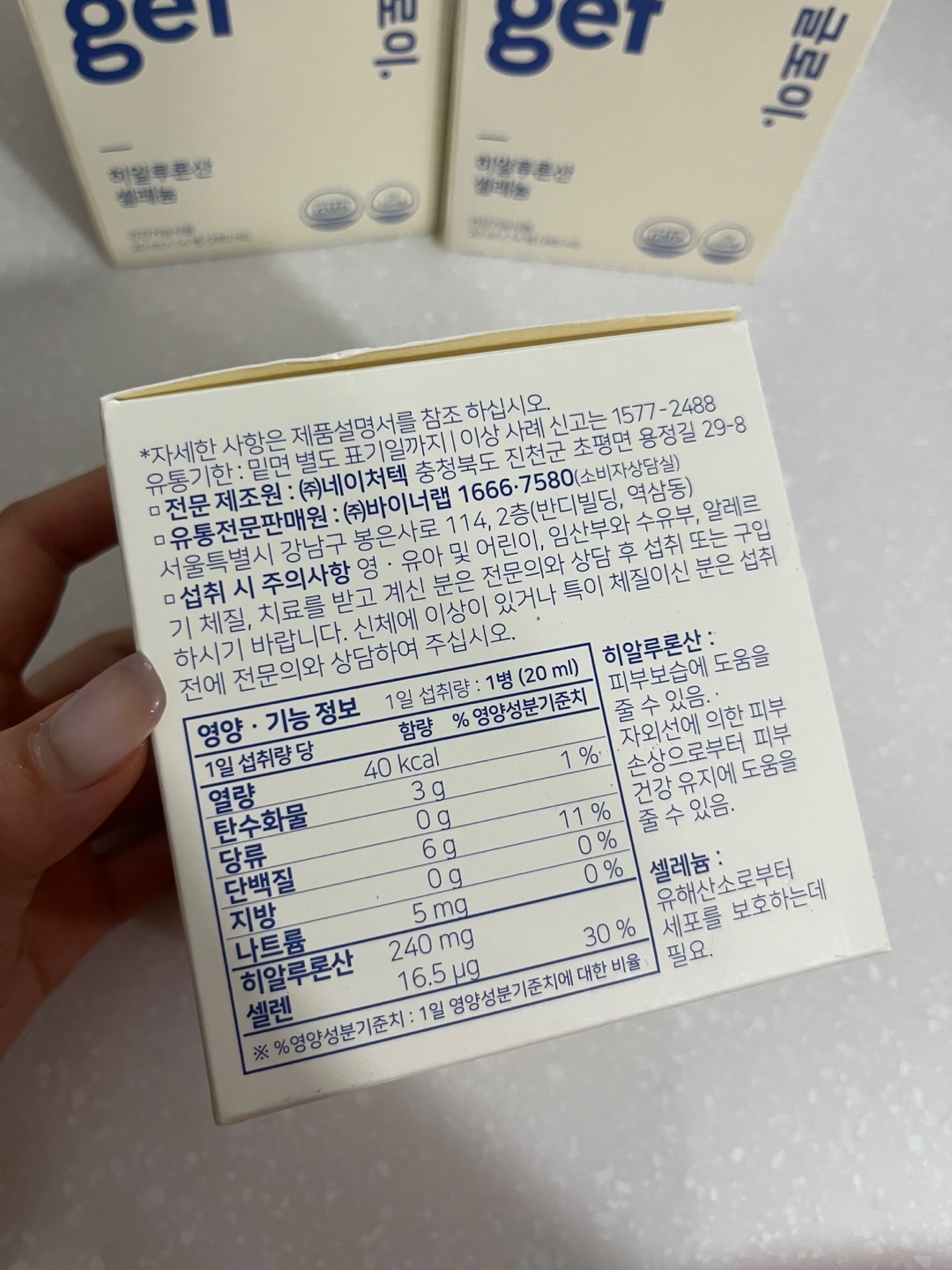 원료명, 함량 관련해서는 위 내용을 참고해주세요. 디디미니님의 설명에 따르면.. 노화의 최대 주범인 자외선으로 손상된 피부까지 회복시킬 수 있는 개별 인정형 히알루론산도 최대함량인 240mg이 들어있고, 건강한 세포를 위한 셀레늄, 콜라겐의 기둥을 연결하고 지지해주는 역할을 하는 엘라스틴까지 들어있다고 하니까요.