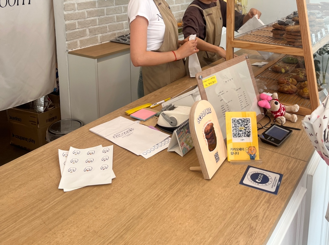 스쿱키 매장 내부는 깔끔하고 넓진 않아요. 아무래도 안 쪽에 쿠키 만드시는 공간이 넓을 것으로 생각(?). 따라서 취식할 수 있는 공간은 거의 없다고 생각하시면 됩니다. 99% 쿠키 포장해서 나오시구요. 때문에 줄이 있어도 회전이 느리진 않아요.
