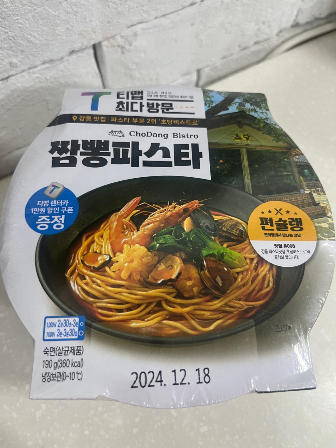 짬뽕파스타는 전자레인지, 뜨거운 물만 준비되어 있으면 어디서든 먹을 수 있는 편의점 간편식인데요. 파스타면, 분말스프, 짬뽕블럭, 액체소스가 들어있습니다. 그리고 티맵과 콜라보해서 그런지 TMAP 렌터카 1만원 할인 쿠폰도 들어있어요!
