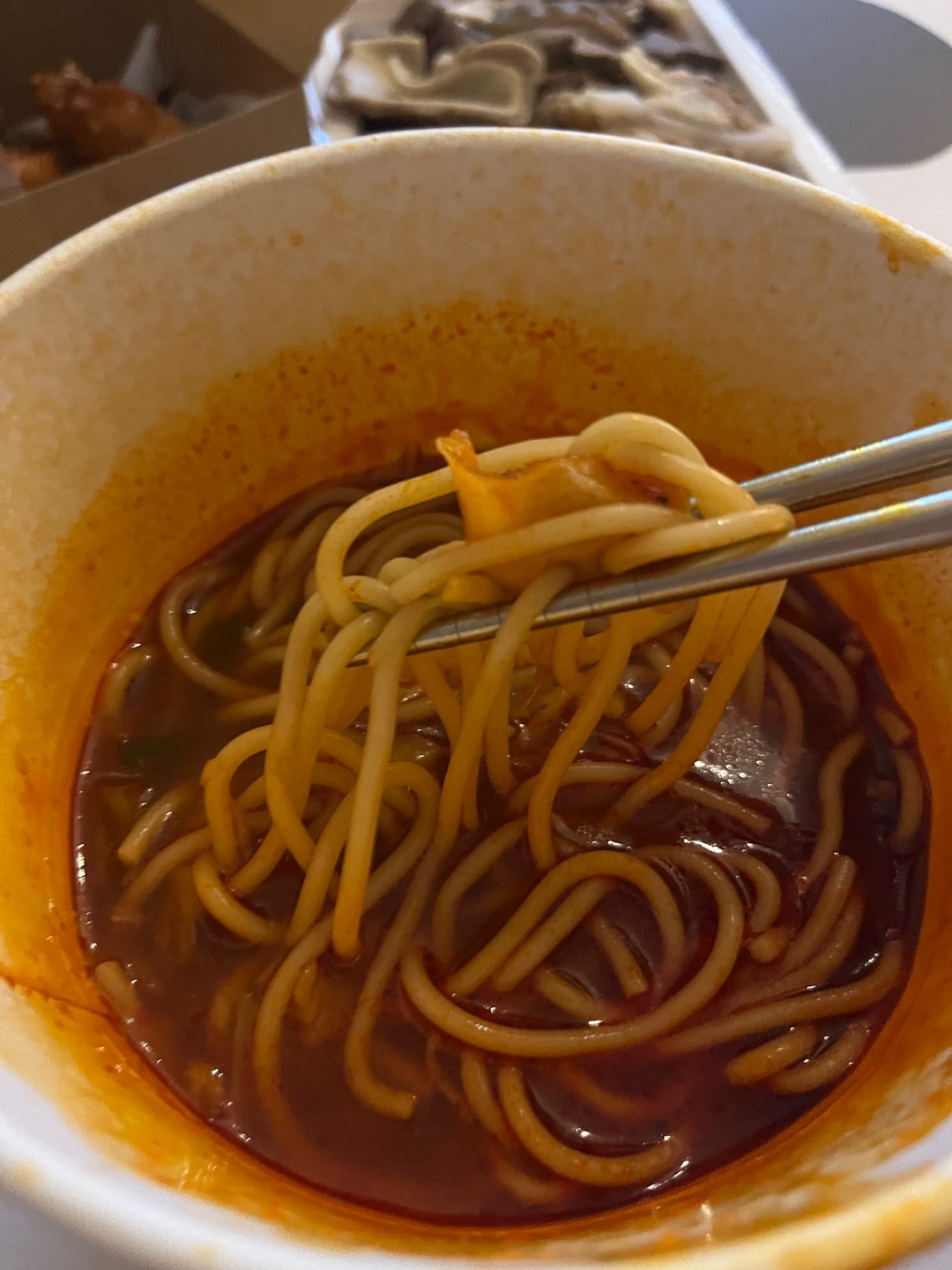 전자레인지 돌린 짬뽕파스타. 요 때 술 한잔 걸친 상태여서 음..? 국물이 이렇게 많은게 맞나? 했는데 초당비스트로 짬뽕파스타 찾아보니 "짬뽕"이라서 그런지 국물이 꽤나 자작하게 있는 요리더라구요. 그리고 국물맛을 딱 보는데 간이 맞음. 💕