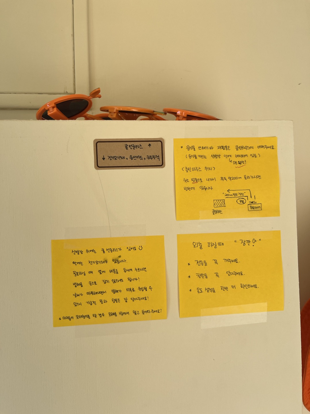 신발장 쪽에는 귀여운 귤모자, 선글라스도 있고 주의사항이랑 유의사항도 적혀있어요. 요런 부분들 하나씩 읽어보고 이용하는게 좋더라구요. 놓칠 수 있는 부분 세심하게 적어놓으신 것들 센스! 👍