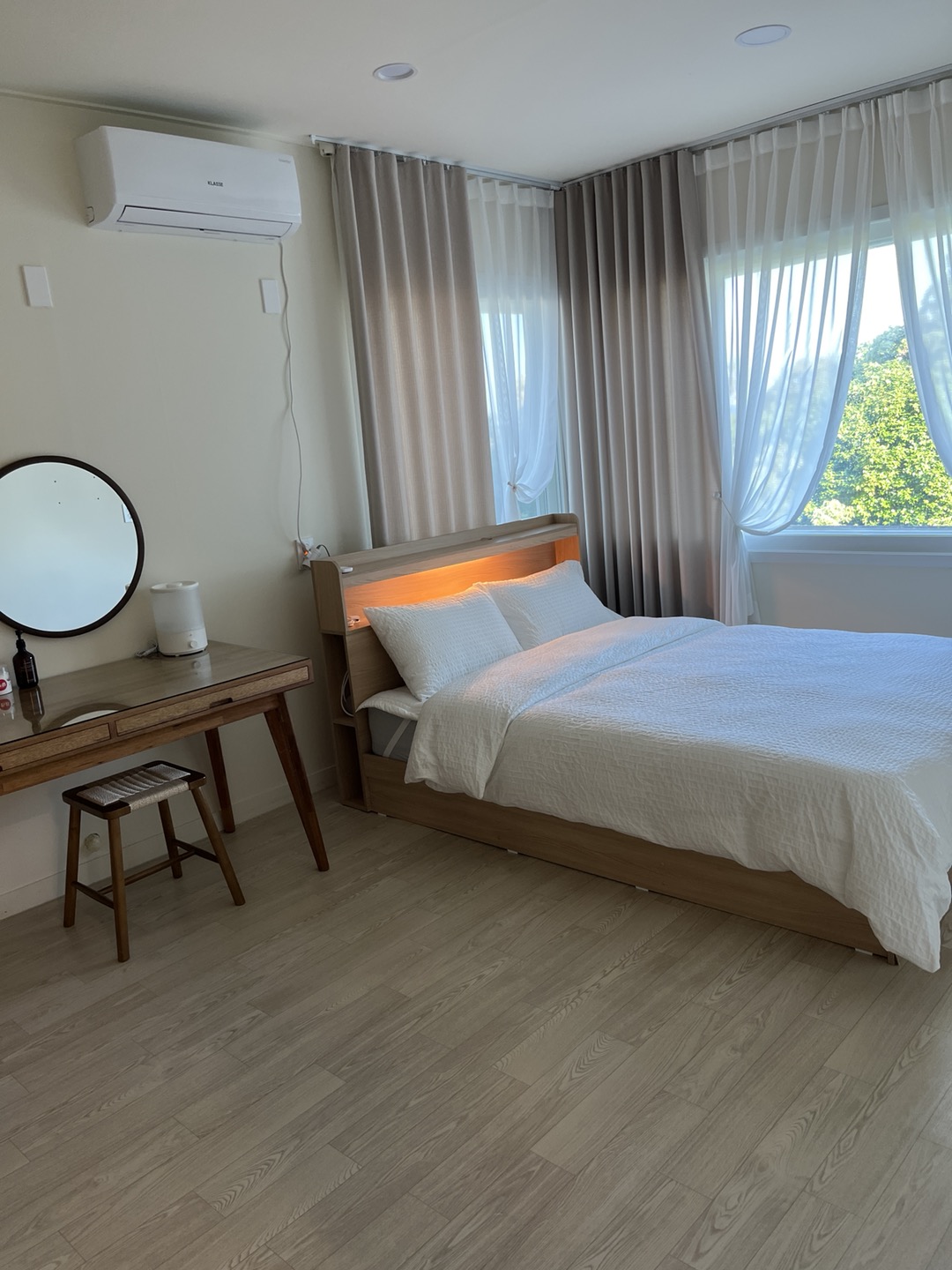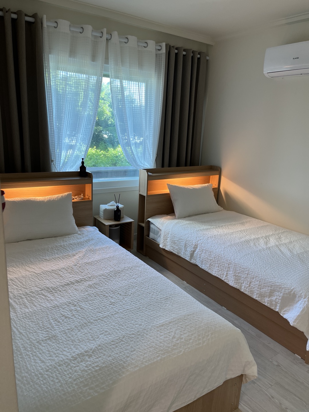 동생부부가 머물렀던 방. 여기도 뷰가 좋고요. 아주 큰방에 비해서는 좁지만, 그래도 충분한 공간입니다. 침구류 화이트 톤이라 더욱 깔끔했어요. 그리고 제주 귤빛스테이 디퓨저 꽃향이 인상적이어서 집에 와 구매하려고 적어놓기까지 했다는.. 근데 유명한 제품이더라구요. 🤣