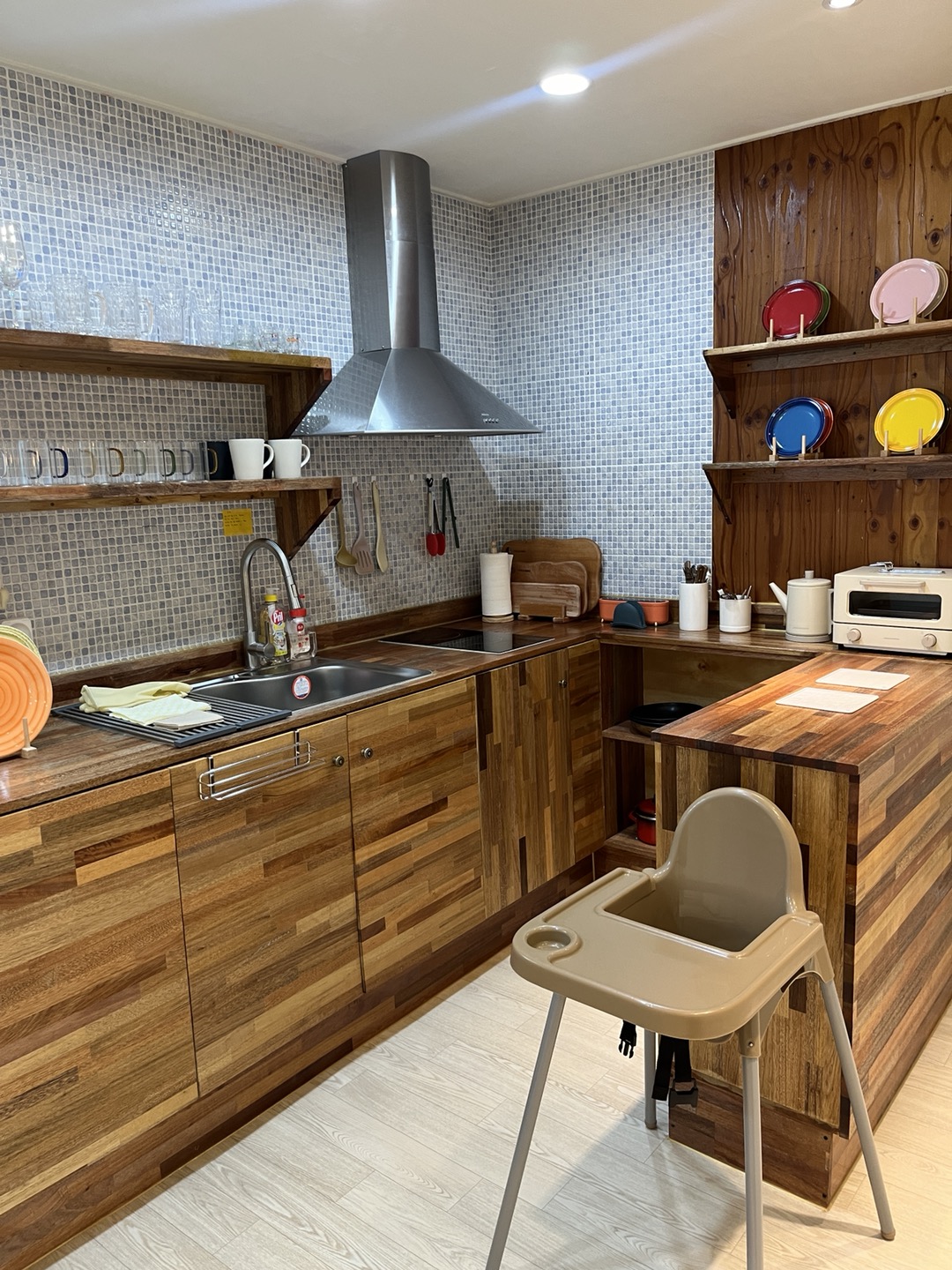 제주 귤빛스테이 주방에는 이미 식기나 각종 용품들 많이 준비되어 있었어요. 아기의자도 있어서 편했고, 정수기와 밥솥, 전자레인지, 토스트기, 전기포트, 핸드드립커피세트, 후라이팬, 각종 식기와 잔 등이 있습니다.