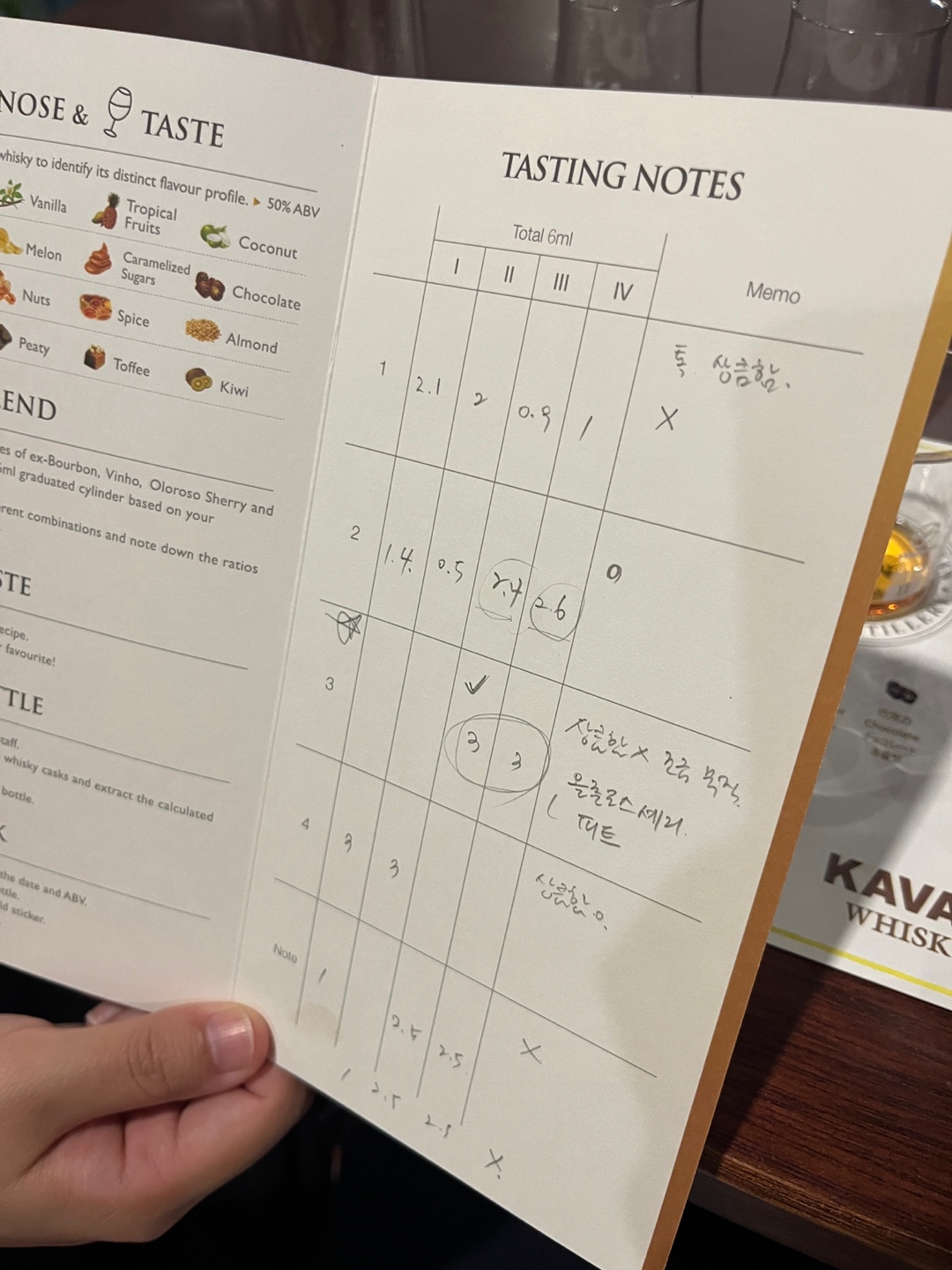 4가지 종류의 버번, 올로로소셰리, 비노, 피트 위스키를 시향하고 시음하고 다양한 용량으로 블렌딩 해보고, 내 취향인 배합 비율로 완성시키면 됩니다. 😋