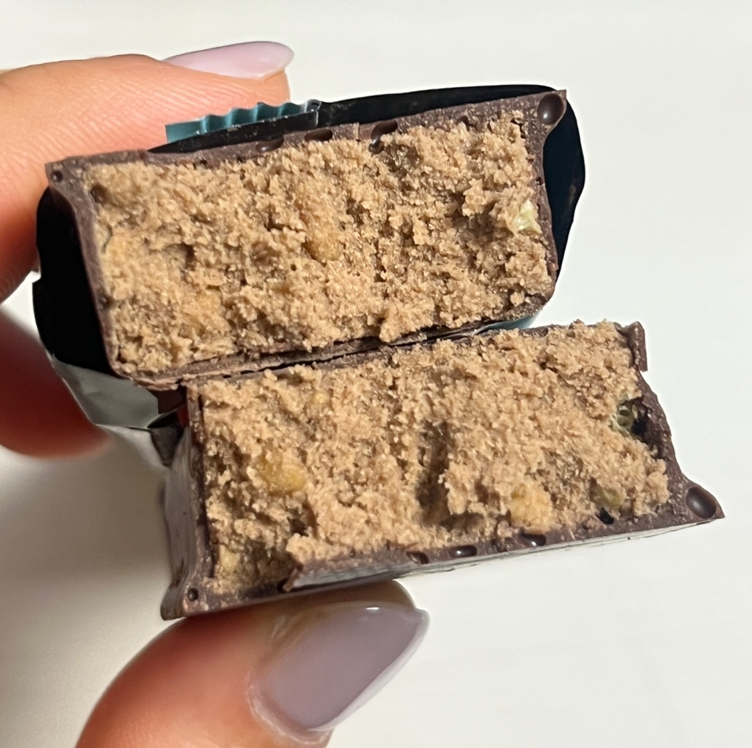 반갈하면 요런 느낌이고요. 식감은 특별히 느껴지지 않고, 마찬가지로 자유시간과 비슷한 초코바입니다. 자유시간 먹고싶은데 조금 덜 나쁜(?), 조금은 건강한 제품 선택하고 싶다면 이왕이면 단백질 함유 높은 하림 오늘단백 선택해보시는 것도 나쁘지 않을 것 같아요.